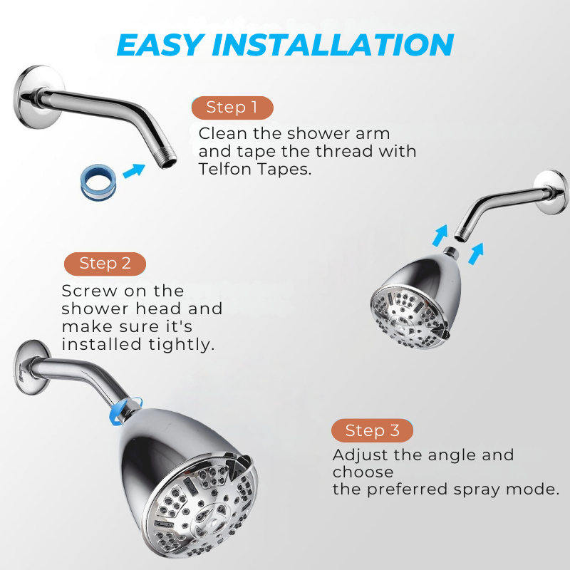 كل ما عليك فعله هو فك رأس الدش القديم وتركيب الجديد باستخدام شريط السباكة! لا حاجة لأدوات أو مساعدة سباك. كما أن تصميمه عالي الجودة يضمن سهولة الصيانة.