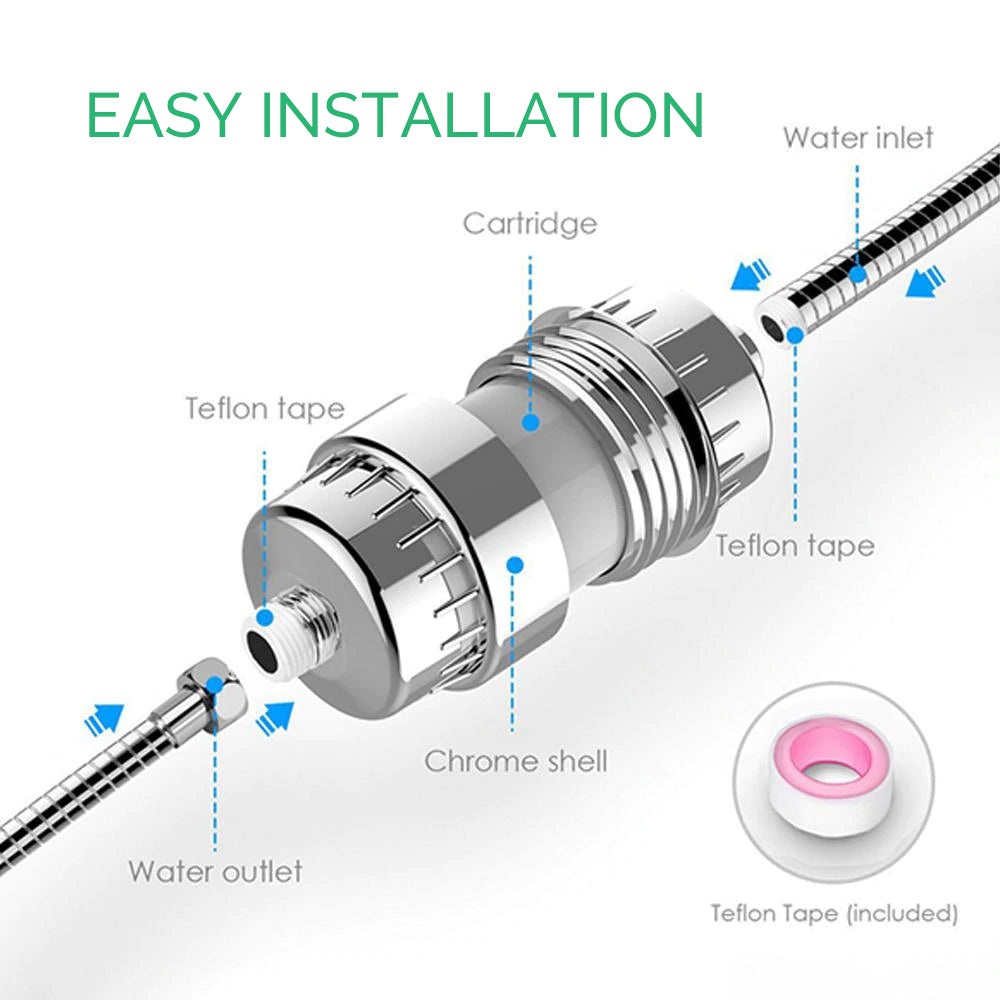 • يعمل فلتر رأس الدش على إزالة جميع المواد الكيميائية المهيجة للجلد والتي تعمل على تعطيل توازن درجة الحموضة في بشرتك وتتركها مثيرة للحكة ومتقشرة وجافة.