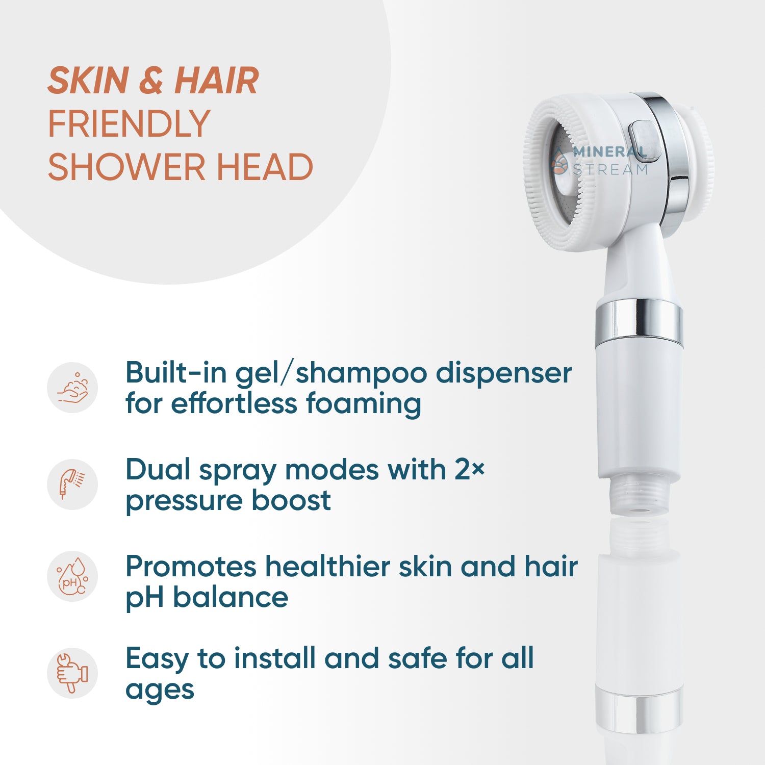 MineralStream™ Cotton Shower Head is apart from its built-in dispenser for shower gel or shampoo. This eliminates the need for separate bottles, streamlining your shower space and routine. Filling is straightforward: simply remove the back cover, add your preferred bathing product, and then gently press the silicone head to dispense rich, even foam.